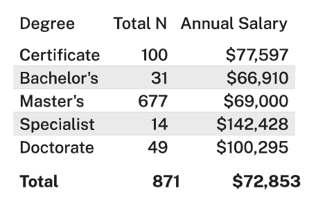 After students graduate from American College of Education they are invited to participate in an exit survey to help ACE better serve its students by gaining an understanding of what ACE did well, what it could improve upon, and what graduates plan on doing with their degree. The statistics below provide information regarding ACE’s continuing education, employment, and earnings metrics as reported to the institution by its graduates.